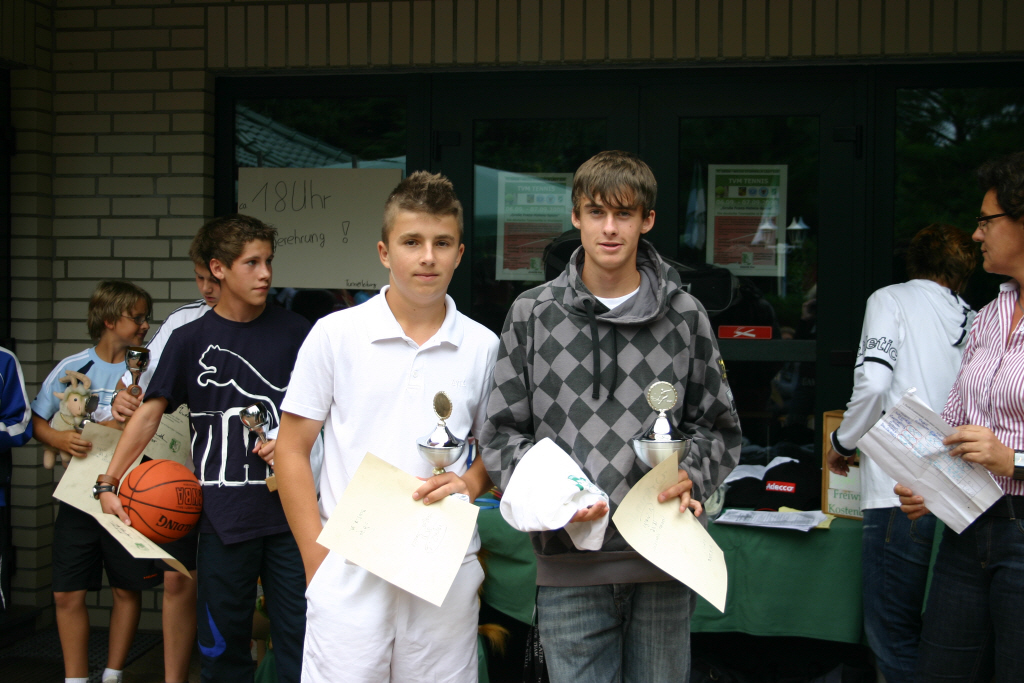 Die diesjährigen Endspiele der Clubmeisterschaften des TC Grün-Weiss Stommeln fanden bei besten Wetterbedingungen am Sonntag, 14. September 2008 statt. Spanndende Begegnungen wurden von zahlreichen Zuschauern und natürlich den jeweiligen Fans beobachtet. In der Siegerehrung um 18:00h wurden den Erst- und Zweitplatzierten aller Konkurrenzen die Siegerpokale bzw. die schon zur Tradition gewordenen grün/weißen Handtücher überreicht; anschließend stellten sich die Sieger zum gemeinsamen Gruppenfoto zusammen. Zusätzliches Highlight war eine große Tombola mit vielen attraktiven Preisen - sämtliche Lose wurden verkauft, so dass die Jugendkasse gut gefüllt wurde. Impressionen der Siegerehrung und dem Ausklang in lockerer Runde finden sich in der Fotogalerie.